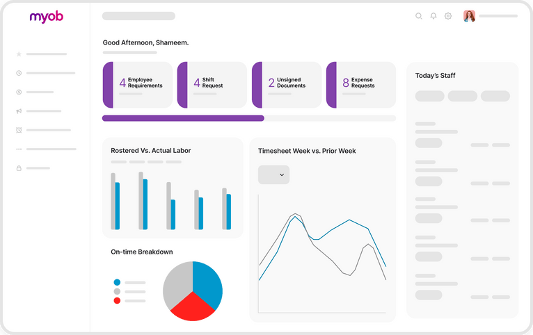 MYOB Acumatica Workforce Management gives you the best possible view of how your team is performing with built-in dashboards. You can track metrics such as rostered vs. actual hours, compare timesheets across working weeks, and break down staff attendance based on their clock-in behaviour. All dashboards and reports are role-specific, so every employee only sees the data that is relevant to their role and sensitive data remains protected. This data also feeds into your core Acumatica ERP system, so you can evaluate project profitability with actual payroll data, without manual data duplication across systems.
